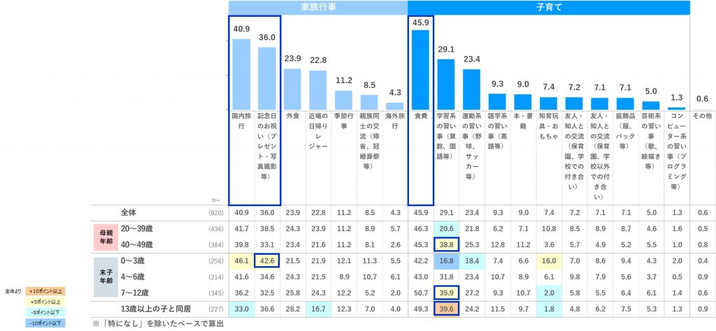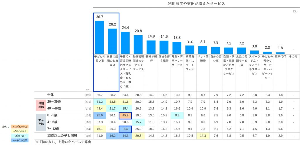 「日帰りレジャー」22.8%もあがりますが、前問での頻度・支出が減ったサービスとしてレジャーが上位になっていた事から、優先したい中でも実際には優先できていない現状が推察されます。属性別では、「末子年齢:0~3歳」にて「記念日のお祝い」42.6%と全体より+6.6ptsです。また「学習系の習い事」は「母子年齢:40~49歳」38.8%(+9.7pts)、「末子年齢:7~12歳」35.9%(+6.8pts) 、「13歳以上の子と同居」39.6%(+10.5pts)が全体より高くなっています。