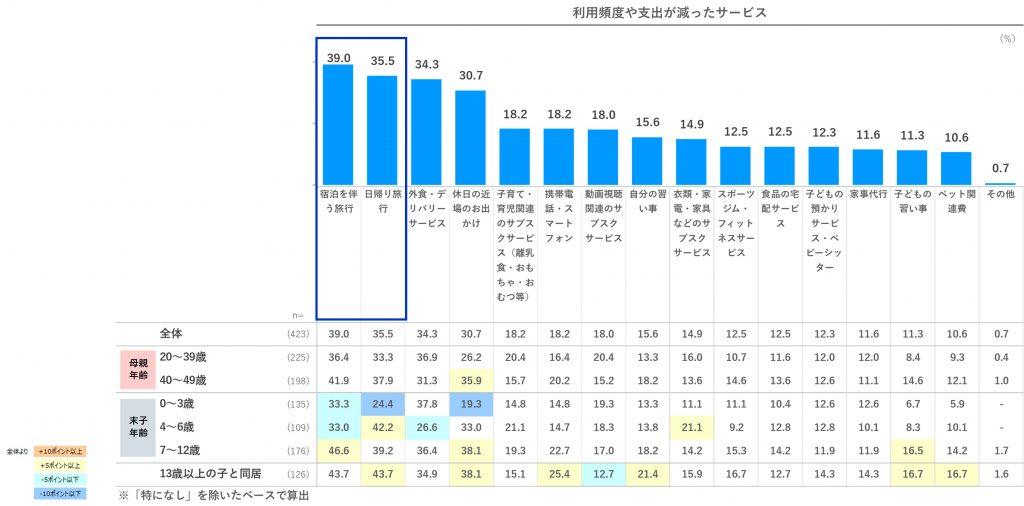 頻度・支出が増えたサービス第1位は「子どもの習い事」36.7% 、次点は「休日の近場のお出かけ」28.2%。一方で、頻度や支出が減ったサービスでは、「宿泊を伴う旅行」39.0%、「日帰り旅行」35.5%とレジャーが上位となった。