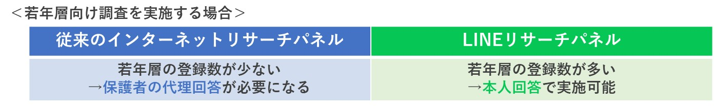 LINEリサーチの特徴の一つとして、13歳から本人回答が可能である点が挙げられます。従来のインターネットリサーチパネルでは若年層の登録数が少ないため、本人回答の回収数を確保するのが難しく、結果的に保護者の代理回答を余儀なくされることがあります。それに対し、LINEリサーチでは若年層の登録数が多いため、調査の設計や内容を配慮した上で、本人回答による若年層のリアルな声を収集することができます。