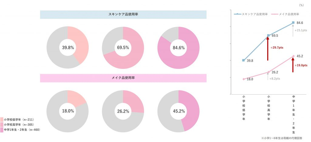 使用率の推移を確認すると、スキンケア品は小学校高学年で大きく増加し(低学年+29.7pts )、メイク品は中学生になると使用率が大きく伸びています。 (高学年+19.2pts )。