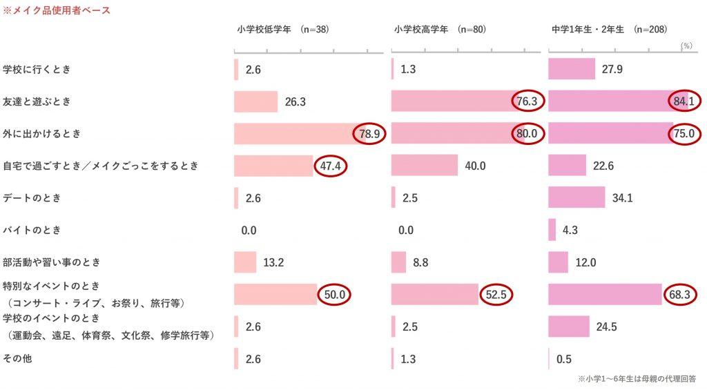 メイクをするシーンについて、小学校低学年は「外に出かけるとき」が最も多く、次いで「特別なイベントのとき」「自宅で過ごすとき/メイクごっこをするとき」が続く。小学校高学年では「外に出かけるとき」が最も多く、次いで「友達と遊ぶとき」「特別なイベントのとき」の順。中学1年生・2年生では「友達と遊ぶとき」が最も多く、2番目以降は「外に出かけるとき」「特別なイベントのとき」。