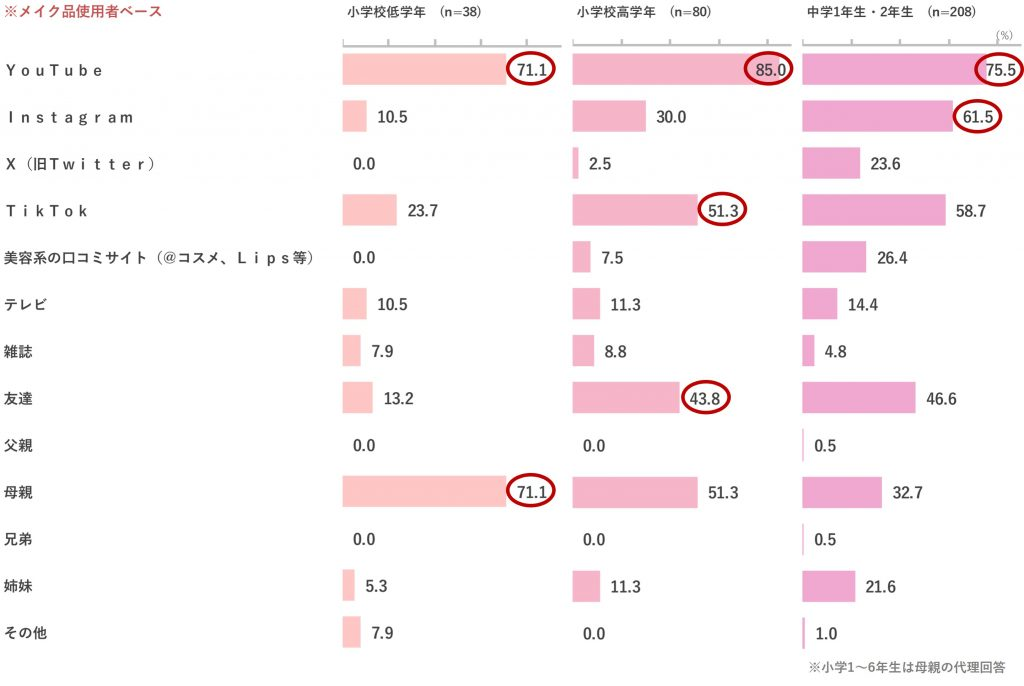 メイクに関する情報源は、どの学齢でも「YouTube」から入手していると回答した割合が最も多い。(小学校低学年は「母親」からの情報も同数値)。