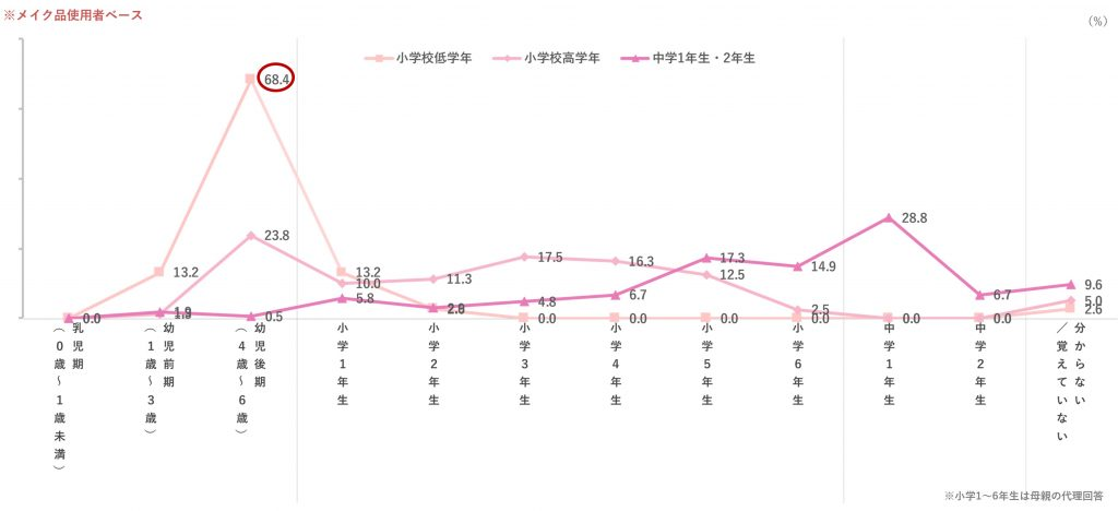 初めてメイクをした時期を確認したところ、現在メイクをしている小学校低学年の68.4%が 「幼児後期(4歳~6歳)」でメイクを始めたと回答しました。小学校に入学する前の幼いうちからメイクに興味を持ち始めていることがわかります。