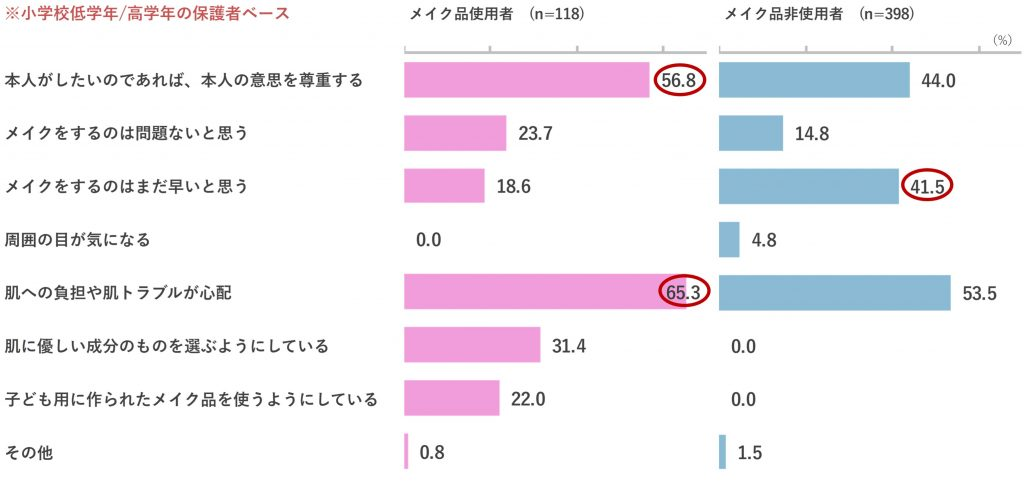 まずメイク品使用者/非使用者別で確認したところ、メイク品使用者の保護者の65.3%が「肌への負担や肌トラブルが心配」と回答しています。ただし、「本人の意思を尊重する」との回答が56.8%あり、心配しながらも本人のやりたいことを実現させている様子がうかがえます。一方、メイク品非使用者の保護者の41.5%は「メイクをするのはまだ早いと思う」と回答しており、メイク品使用者の保護者と比較して+22.9ptsという結果から、やや否定的な様子がうかがえます。