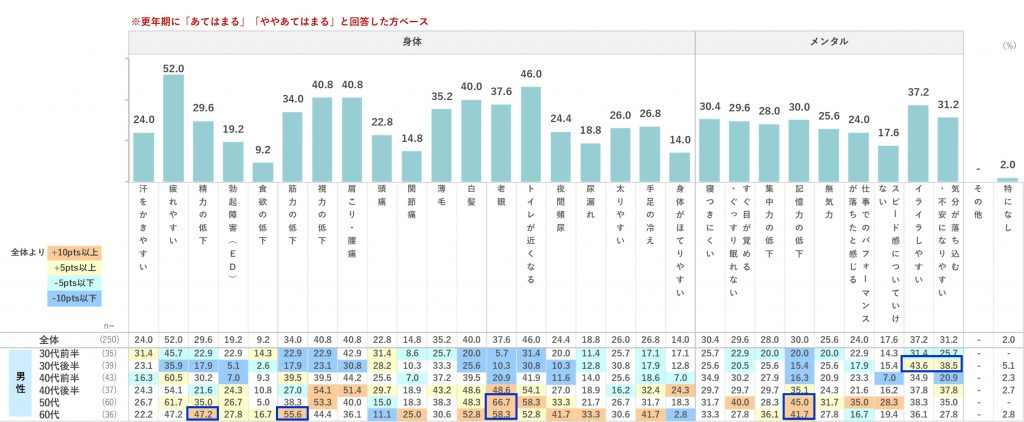 年代別にて、全体と比較して15pts以上高い悩みは「老眼」「筋力の低下」「精力の低下」「記憶力の低下」であり、50・60代に集中しています。「老眼」は50代 66.7%(全体より+29.1pts)、60代58.3%(+20.7pts)、「筋力の低下」55.6%(+21.6pts)などです。30代は全体と比較して低い傾向にあるものの、30代後半にて、「気分が落ち込む・不安になりやすい」38.5%(+7.3pts)、「イライラしやすい」43.6%(+6.4pts)などメンタル上の悩みがやや高くなっています。