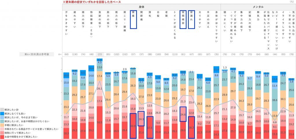 解決したい意向が特に高い悩みは、「頭痛」「夜間頻尿」「尿漏れ」が上位3つに挙げられた。(解決したい計…「お金や時間をかける」「病院に行く」「市販の商品やサービスを使う」の合計値。n=30未満の参考値除く)