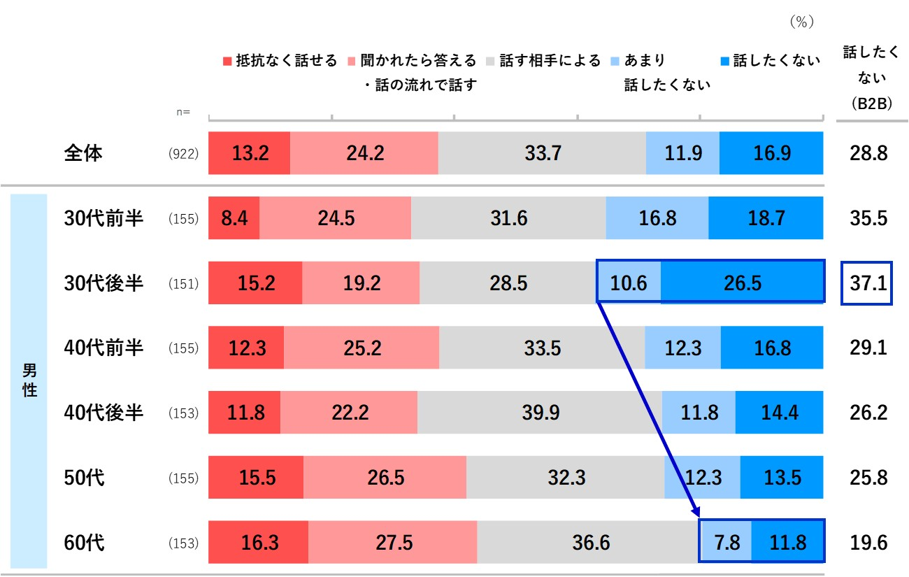 「抵抗なく話せる」は13.2%に留まる一方、「話したくない(B2B)」は28.8%と約3割にのぼる。「話したくない(B2B)」は30代後半で37.1%と最も多いが、年齢が上がるにつれて減少している。