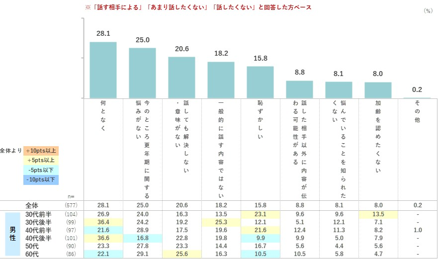 「一般的に話す内容ではない」18.2%、「恥ずかしい」15.8%といった情緒的な理由も一定数あがるものの、「今のところ更年期に関する悩みがない」25.0%、「話しても解決しない・意味がない」20.6%などの合理的な理由が上位となりました。