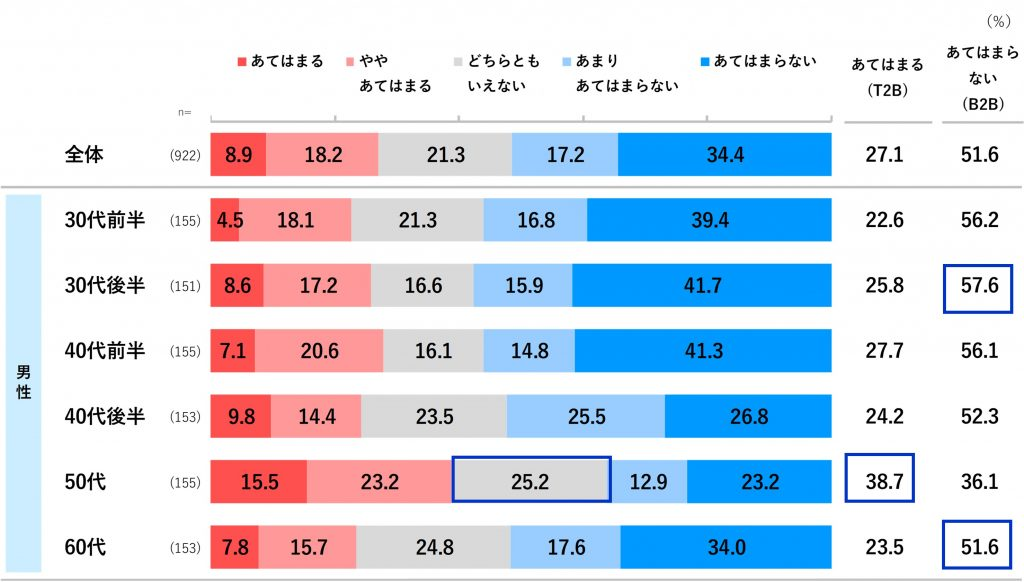 「あてはまる(T2B)」が最も多いのは50代で38.7%ですが、各年代とも2-4割と半数は超えていません。一方、「あてはまらない(B2B)」との回答が最も多いのは30代後半、本調査上の最年長である60代でも半数以上の51.6%があてはまらないと回答しています。「どちらともいえない」は、50代が25.2%と最も多くなっています。