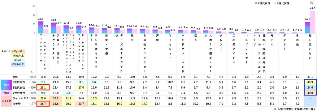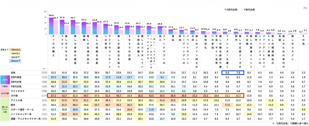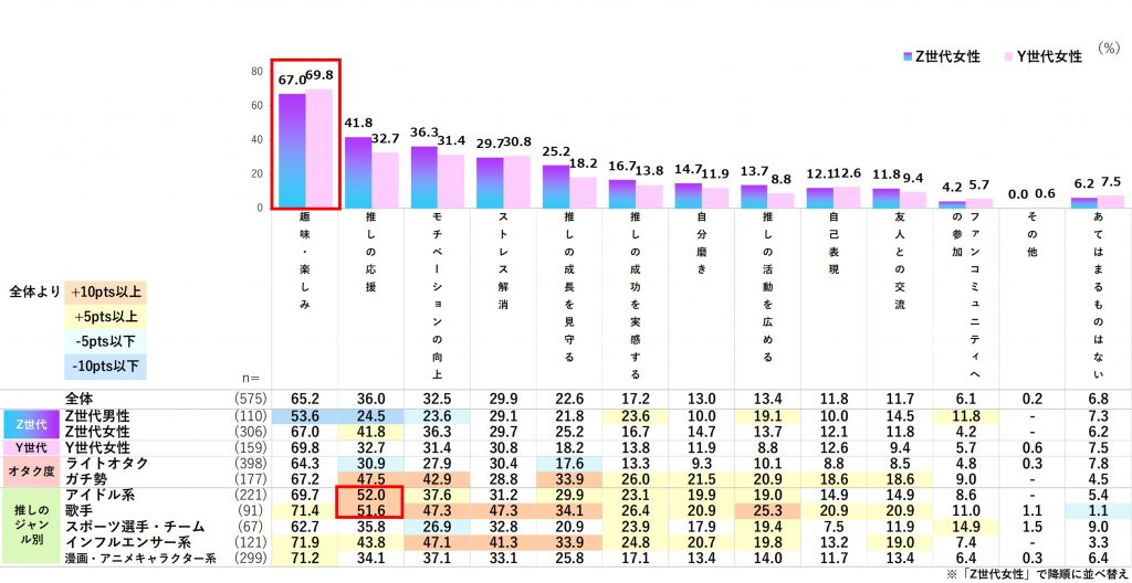 Z世代女性は推し活に時間と投資を注ぐ人の割合が最も高い一方、Y世代女性は家庭との両立で制約も