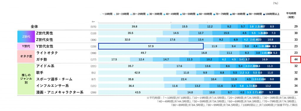 続いて「時間」に関しては、推し活にかける費用と同様に、Y世代女性は10時間以下選択者が57.9%を占めており、Z世代よりも時間をかけない人が多い結果となりました。Y世代女性は家族との時間も多くなり、推し活にかける時間が少ない様子が窺えます。また、ガチ勢は平均時間が44時間という結果となり、日常生活の中でも推し活をすることが当たり前になっていることが考えられます。