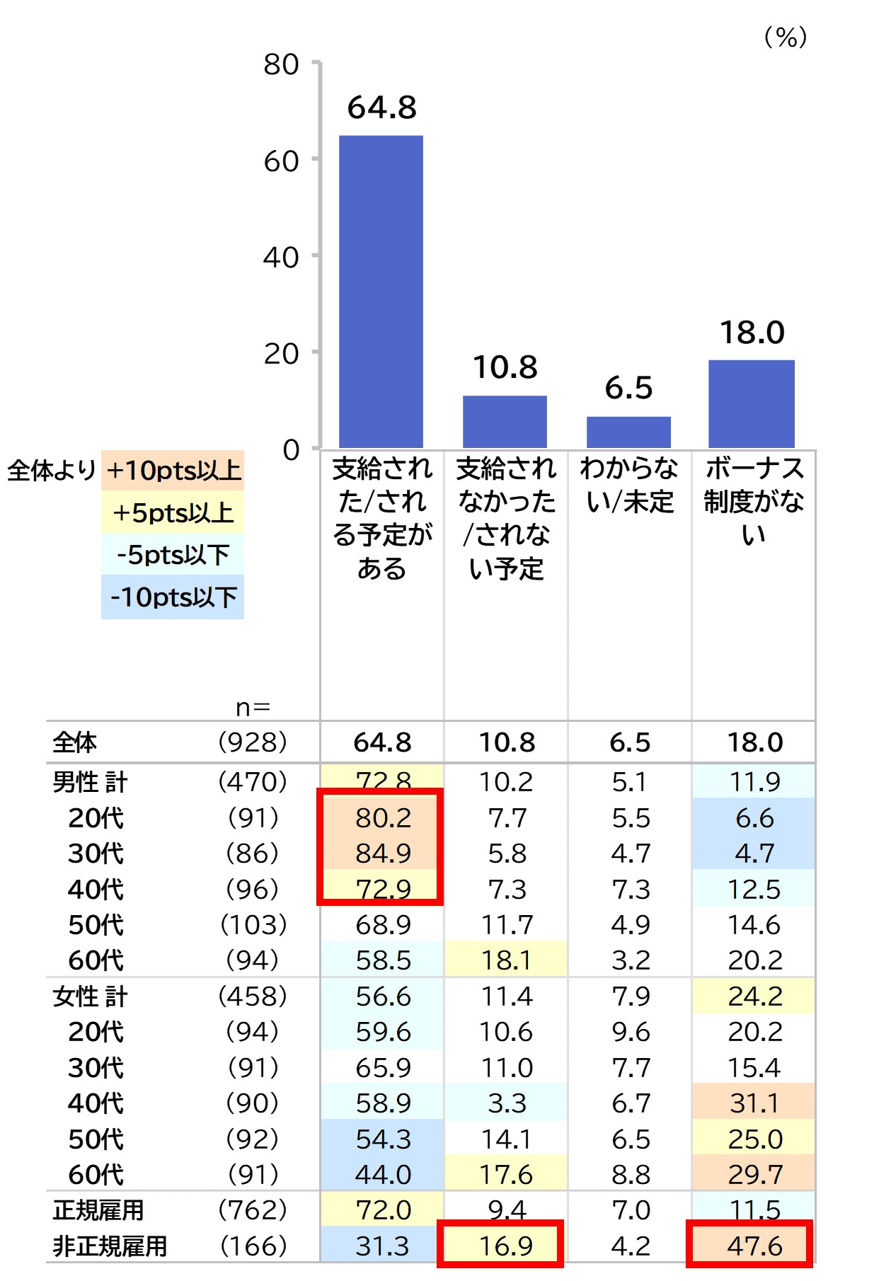 全体では、「支給された/される予定」が64.8%と多くの方に支給されています。特に男性20~40代で支給される割合が高くなっています。雇用形態別では、非正規雇用で「制度がない・支給されない」合わせて64.5%と、支給されない方が多い傾向です。