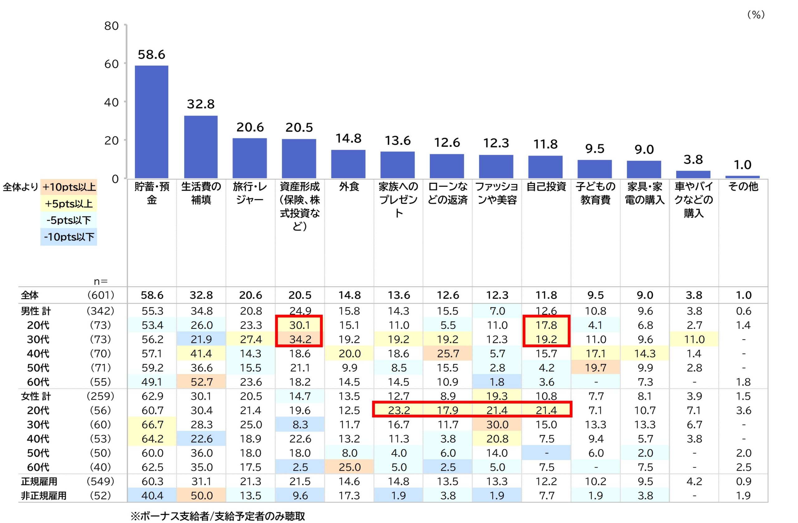 ボーナスの満足度は全体で37.3%に対して、男女20代で約50%と高い。男性20代では他の世代より「資産形成・自己投資」が高く将来への投資への意欲がうかがえる。20代女性は「家族へのプレゼントやファッション・美容」など消費へ回す意欲が高い」。