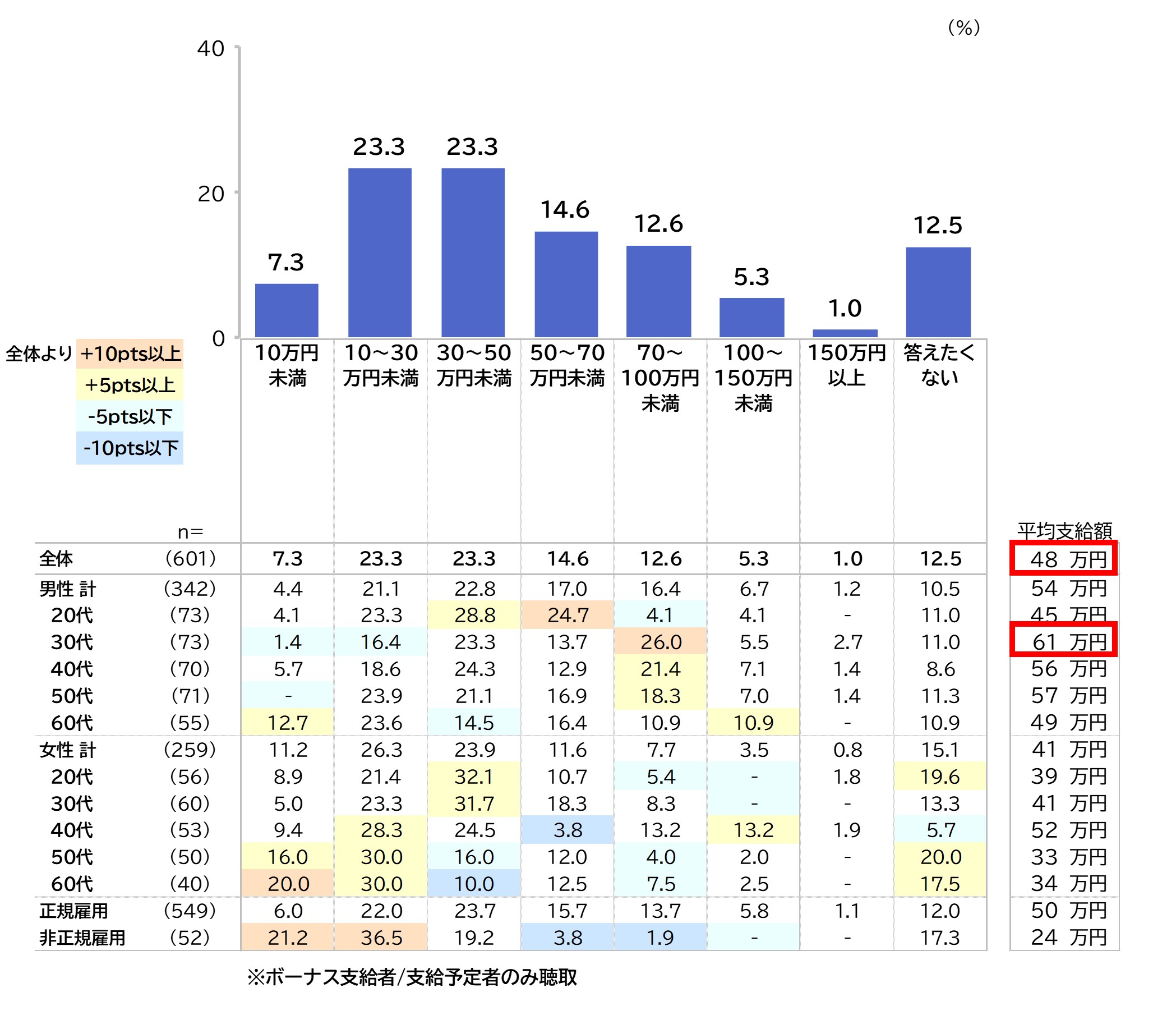 ボーナスの支給額は、全体平均で48万円となっており、最も平均支給額が高いのが男性30代の61万円でした。支給額の昨年との比較では、全体で60.1%がほぼ同じですが、昨年より増えた割合が減った割合よりも10pt高く、全体的には支給額が上がっている様子です。特に男女20代で昨年より増えたが全体よりも高くなっています。