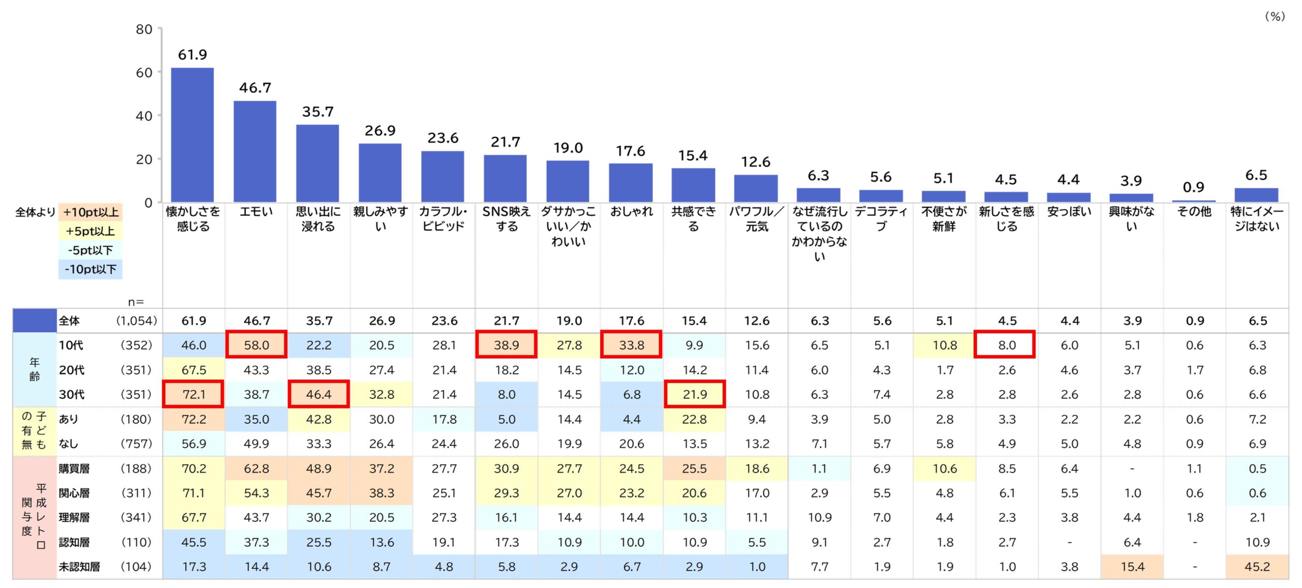 日用消費財における平成レトロの活用は、平成感のある視覚的要素が有効。ただし、カテゴリ別に反応差がみられる