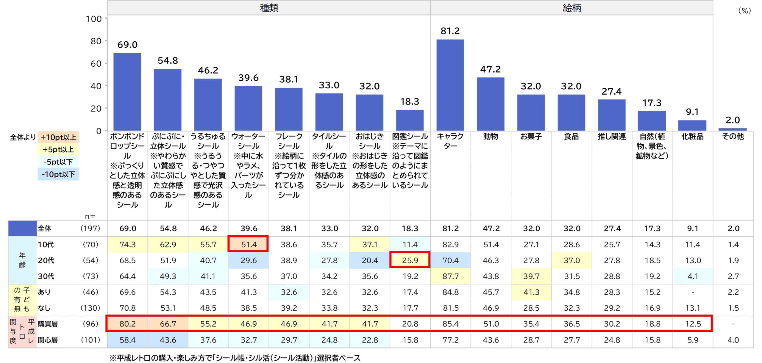 集めているシールの種類は「ボンボンドロップシール」(69.0%)、「ぷにぷに・立体シール」(54.8%)、「うるちゅるシール」(46.2%)など立体感・質感のあるシールが人気です。絵柄では「キャラクター」(81.2%)が圧倒的で、「動物」(47.2%)、「お菓子」「食品」(各32.0%)が続きます。10代は「ウォーターシール」(51.4%)など新しいタイプのシールへの関心が高く、20代は「図鑑シール」(25.9%)が特に高くなっています。購買層は種類・絵柄ともに全体より高いスコアを示し、シール収集への関与度が高いほど多様なシールを集める傾向がみられます。