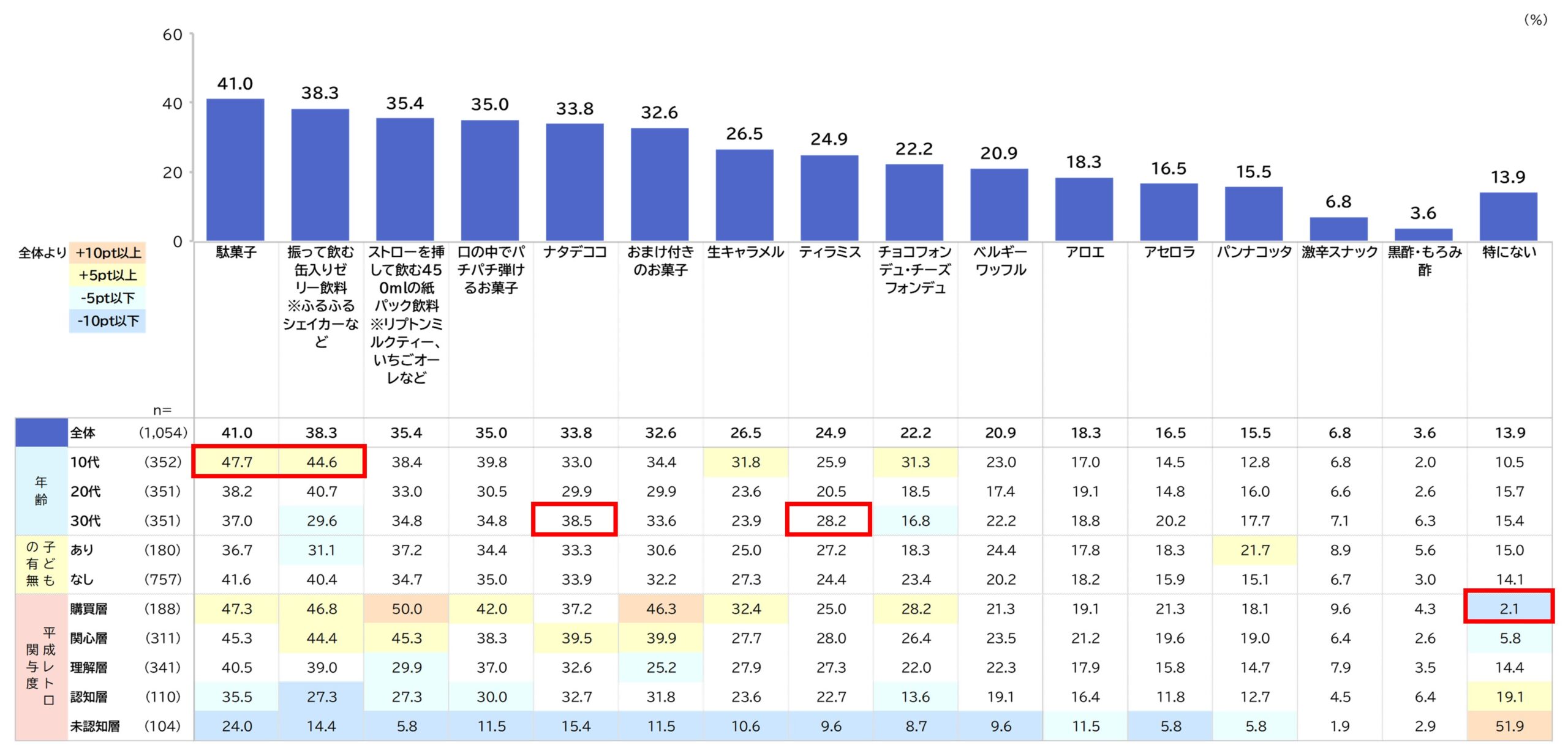 買いたい平成レトロっぽい食品飲料は「駄菓子」(41.0%)、「振って飲む缶入りゼリー飲料」(38.3%)、「ストローを挿して飲む紙パック飲料」(35.4%)、「口の中でパチパチ弾けるお菓子」(35.0%)が上位を占めます。10代は「駄菓子」(47.7%)「振って飲む缶入りゼリー飲料」(44.6%)「チョコフォンデュ」(31.3%)などが高く、体験型・エンタメ性のある商品への関心が強くなっています。30代は「ナタデココ」(38.5%)「ティラミス」(28.2%)など、平成時代に流行したスイーツへの購入意向が高くなっています。購買層は全項目で全体を上回り、「特にない」はわずか2.1%と、平成レトロへの関与度が高い層ほど幅広い食品カテゴリに購入意欲を示すことがわかります。