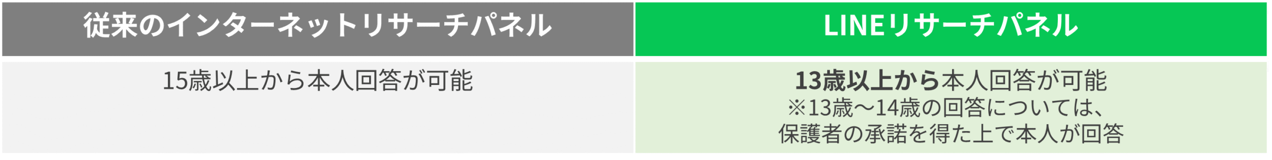 一方、LINEリサーチでは保護者の承諾を得た上で13歳から本人回答が可能であり(※)、若年層のリアルな声を直接収集することができます。