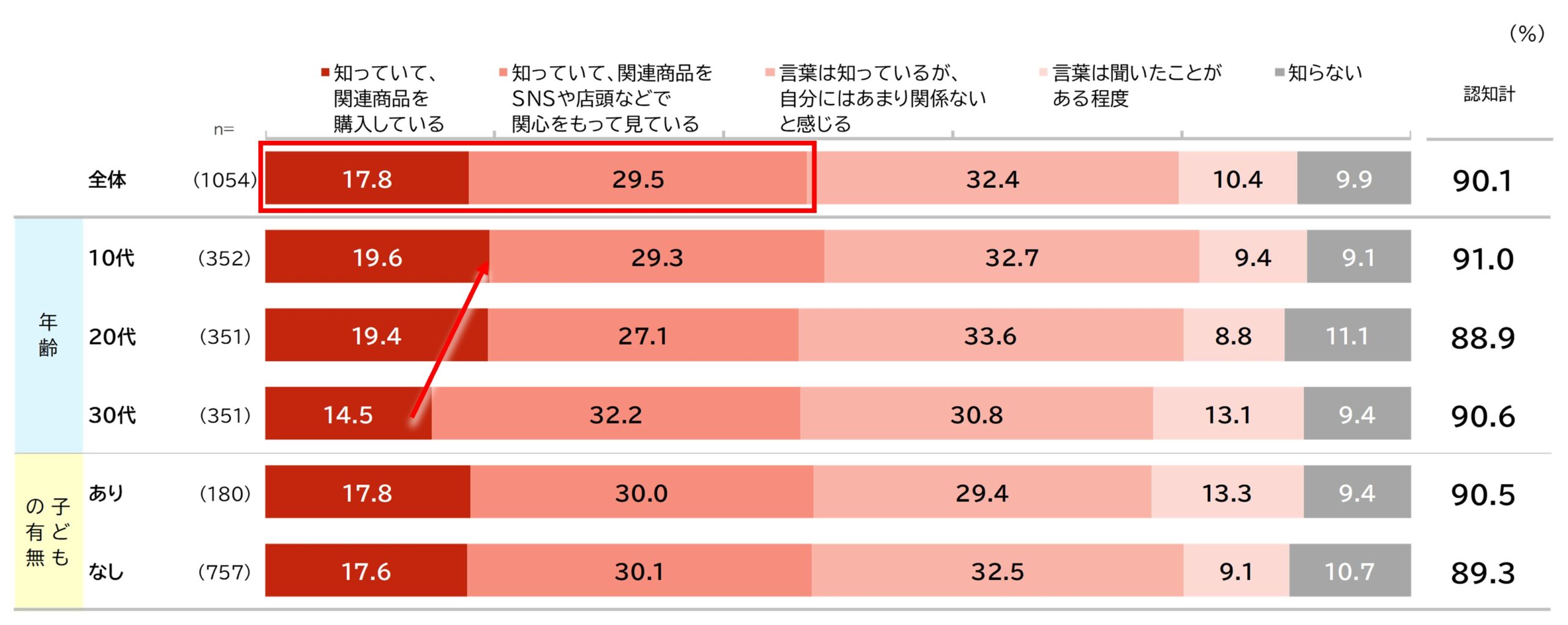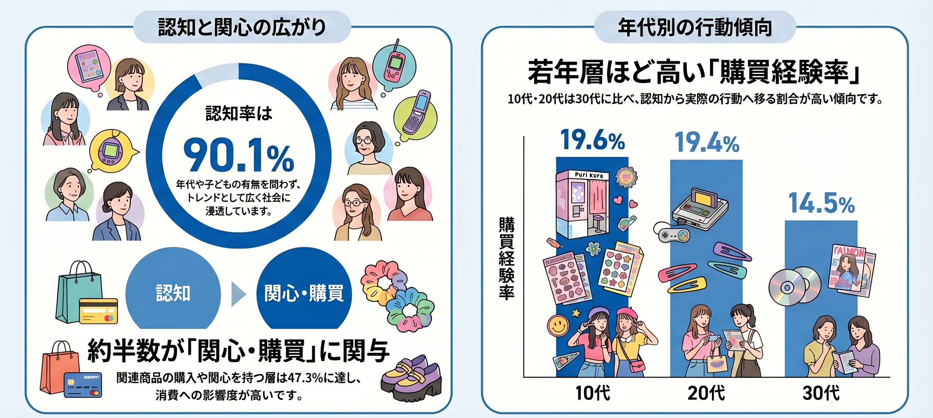 「平成レトロ」の認知率は 90.1% と非常に高く、年代や子どもの有無を問わず広く浸透している。また、関連商品を購入・関心をもって見ている層は 47.3% と約半数に達し、単なる認知にとどまらないトレンドとなっている。購買経験率は10代 19.6%、20代 19.4% と、30代(14.5%)より高く、若年層ほど行動に結びつきやすい傾向がみられる。