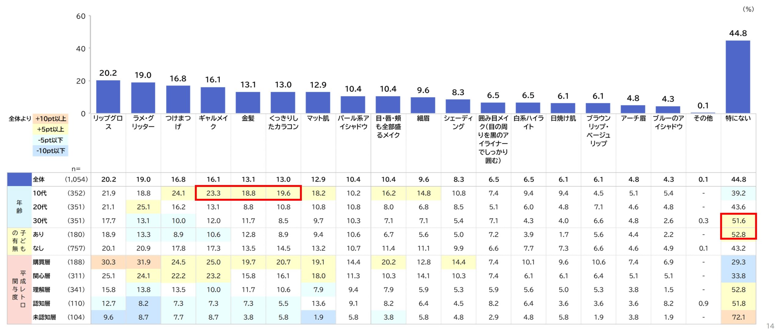 取り入れたい平成メイクは「リップグロス」(20.2%)、「ラメ・グリッター」(19.0%)、「つけまつげ」(16.8%)が上位だが、「特にない」(44.8%)も多く、平成メイクへの関心は限定的です。10代は「ギャルメイク」(23.3%)「金髪」(18.8%)「くっきりしたカラコン」(19.6%)など、大胆なスタイルへの挑戦意欲が高くなっています。30代・子どもありの層は全体的にスコアが低く、「特にない」がそれぞれ51.6%、52.8%と半数を超え、平成メイクへの関心は若年層に偏っています。購買層・関心層は全体より高いスコアを示すものの、平成メイクは他カテゴリと比較してターゲットが若年層に限定される傾向が強くなっています。