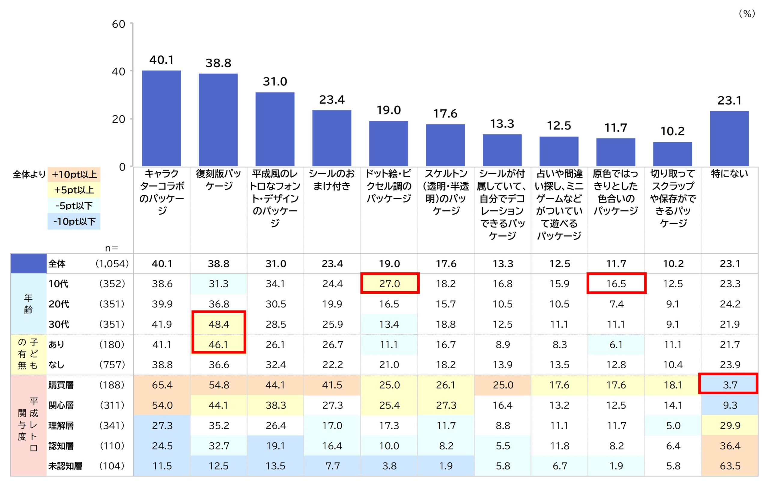 平成レトロっぽいパッケージで購入意向が高いのは「キャラクターコラボのパッケージ」(40.1%)、「復刻版パッケージ」(38.8%)、「平成風のレトロなフォント・デザインのパッケージ」(31.0%)です。10代は「ドット絵・ピクセル調」(27.0%)「原色ではっきりとした色合い」(16.5%)など視覚的なインパクトを重視する傾向があります。30代・子どもありの層は「復刻版パッケージ」がそれぞれ48.4%、46.1%と高く、過去に馴染みのあるパッケージへの親和性が高くなっています。購買層は全項目で全体を大きく上回り、「特にない」が3.7%と低いことから、平成レトロへの関与度が高いほどパッケージデザインへの反応も敏感であることがわかります。