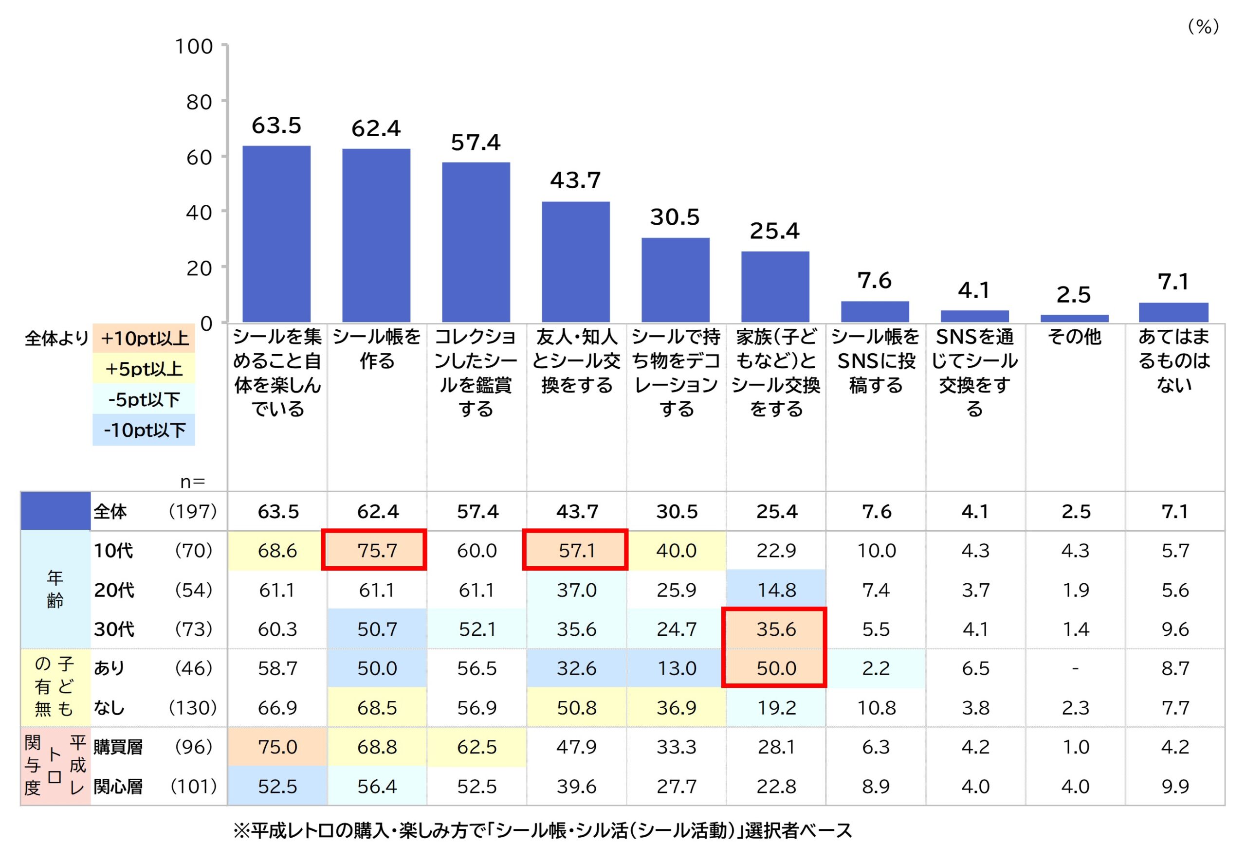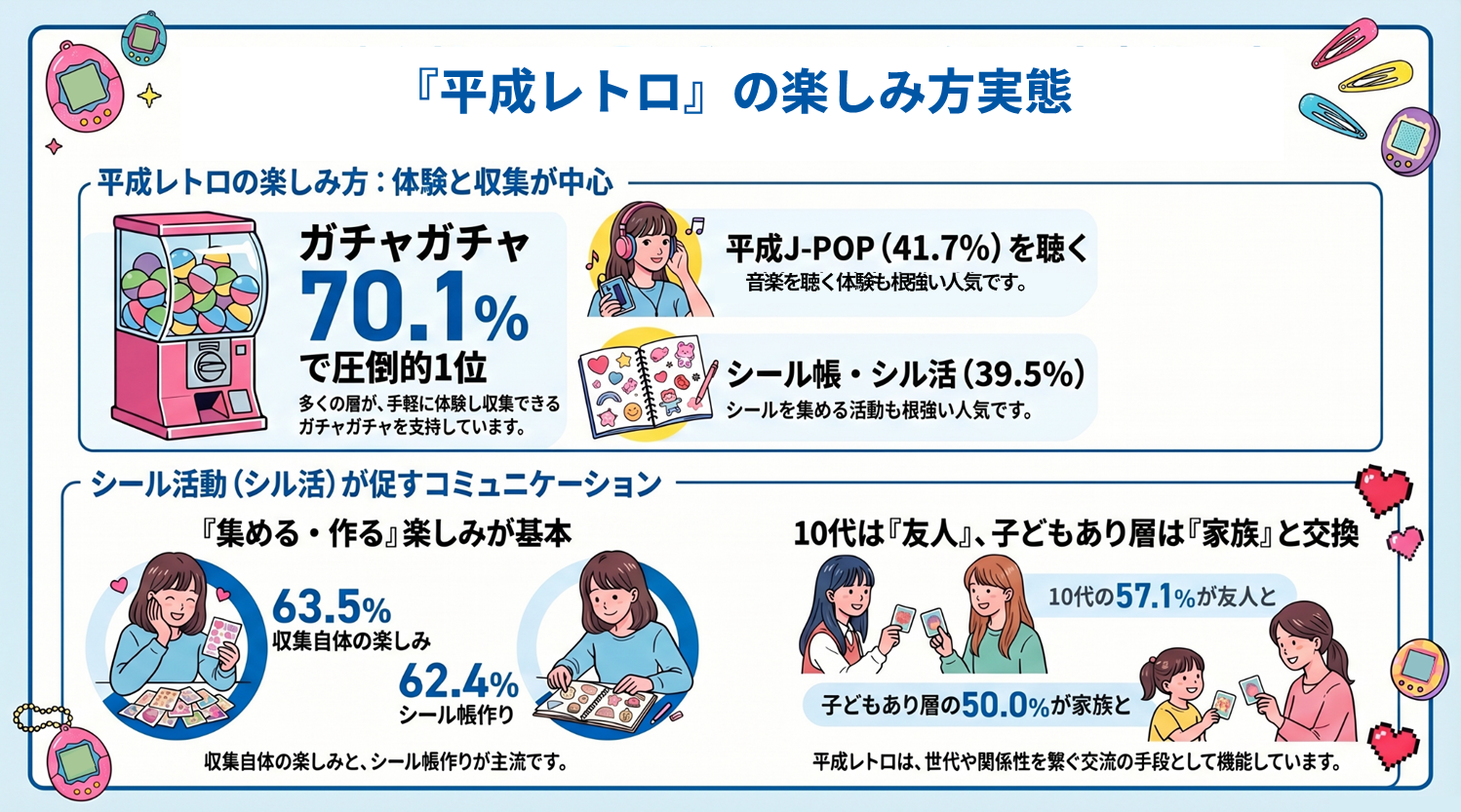 平成レトロの楽しみ方では、「ガチャガチャ」が 70.1% と最も高く、「平成J-POPを聴く」(41.7%)、「シール帳・シル活」(39.5%)が続く。シール活動では「集めること自体を楽しむ」が 63.5%、「シール帳を作る」が 62.4% と高く、10代では友人との交換(57.1%)、子どもあり層では家族との交換(50.0%)が目立つ。平成レトロは、個人消費に加え、コミュニケーションを生む行動として楽しまれている。