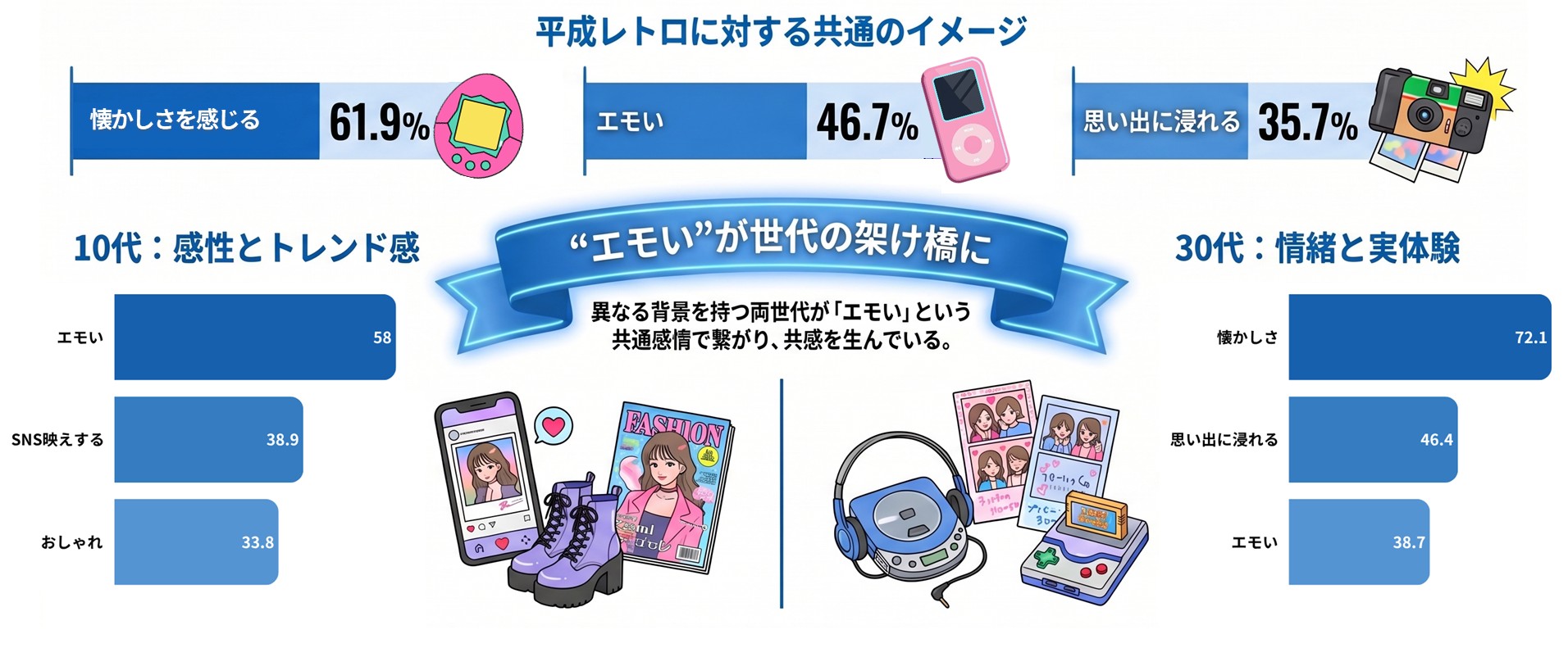 平成レトロに対するイメージは「懐かしさを感じる」(61.9%)が最多で、「エモい」(46.7%)、「思い出に浸れる」(35.7%)が続く。10代では「エモい」(58.0%)や「SNS映えする」(38.9%)、「おしゃれ」(33.8%)といった感性・トレンド感が強調される一方、30代では「懐かしさ」(72.1%)や「思い出に浸れる」(46.4%)など自身の体験と結びついた情緒的価値が高い。このように、平成レトロは「感性」と「懐かしさ」が“エモい”という共通感情で結びつき、世代を超えて共感を生むことが、ここまで流行している大きな要因と考えられる。