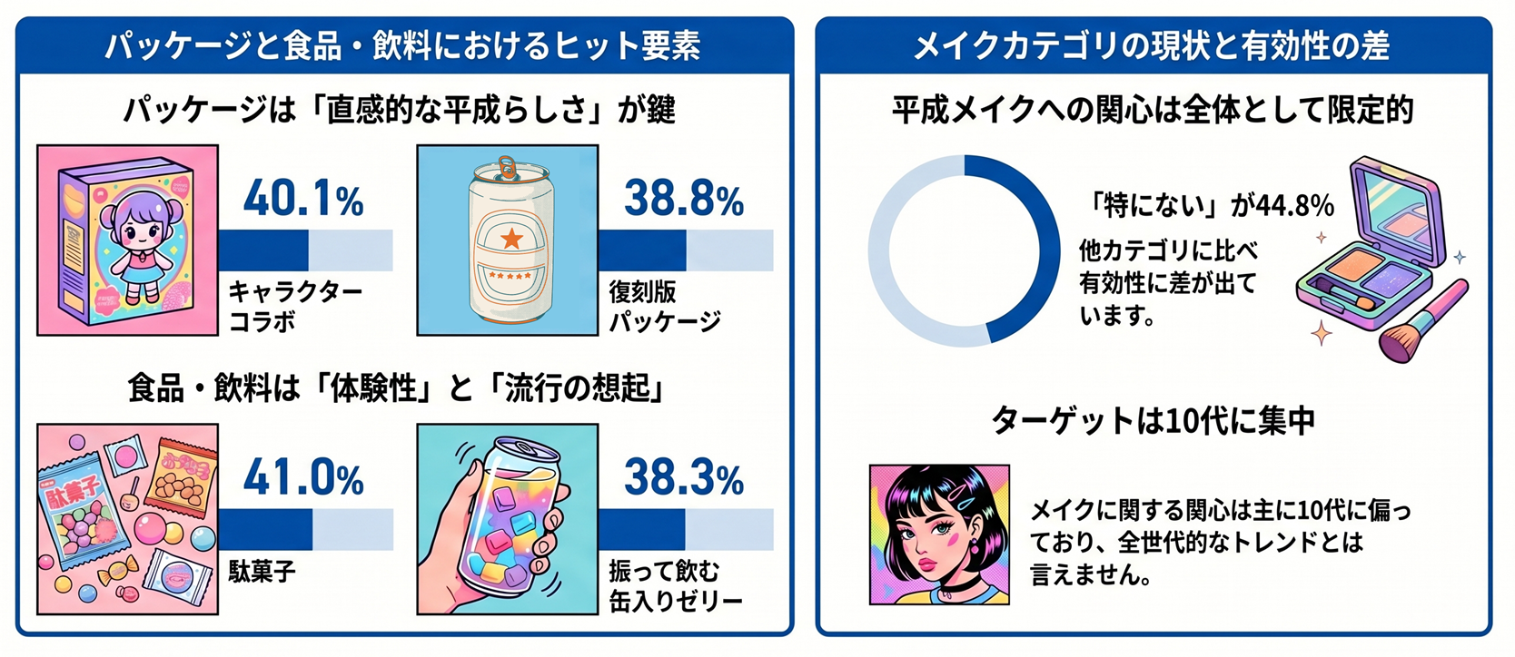 パッケージでは「キャラクターコラボ」(40.1%)や「復刻版」(38.8%)が支持され、平成らしさが直感的に伝わる要素が購入意向を高めている。食品・飲料では「駄菓子」(41.0%)や「振って飲む缶入りゼリー飲料」(38.3%)など、体験性や当時の流行を想起させる商品が選ばれている。一方、平成メイクは「特にない」が 44.8% と高く、関心は主に10代に偏っており、カテゴリごとに有効性の差がみられる。