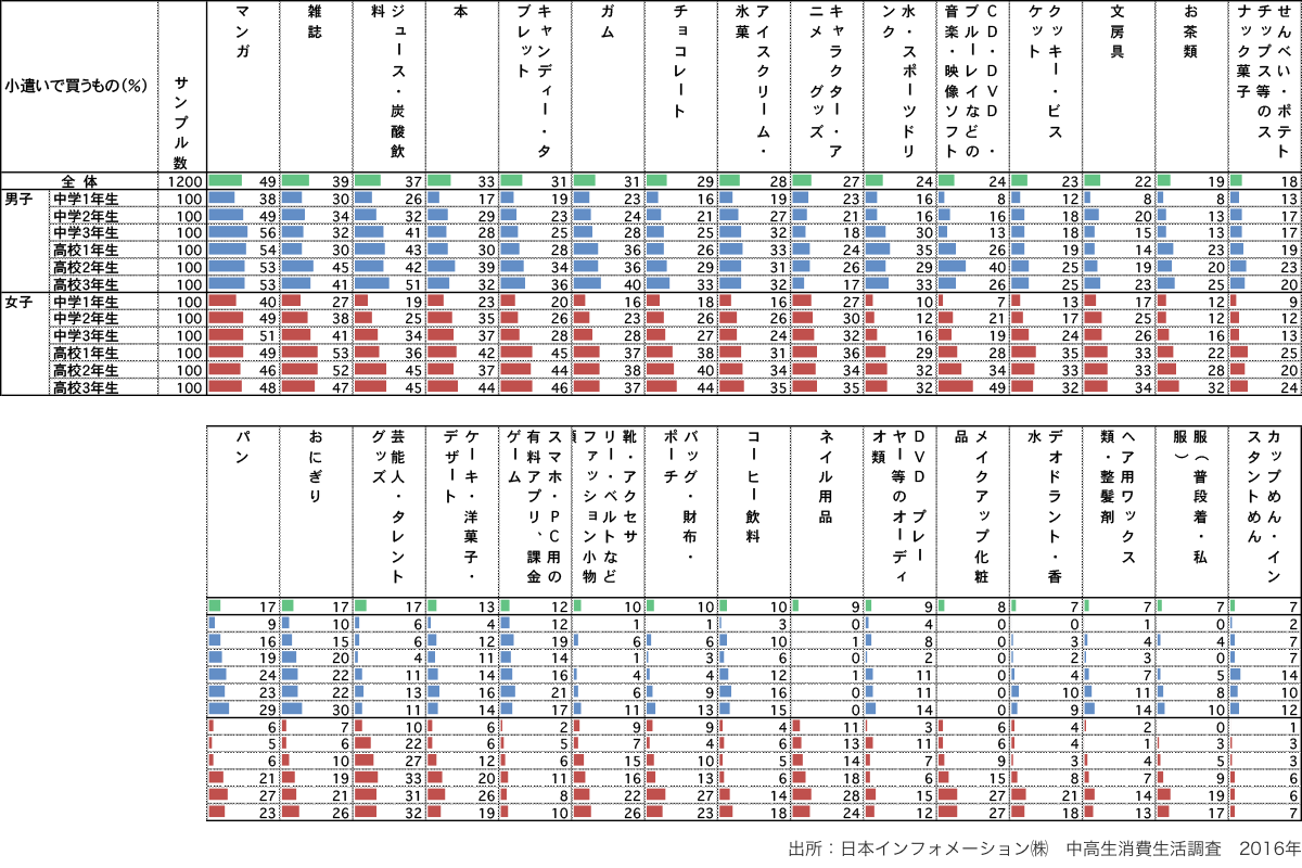 - 中高生が小遣いで買っているものとしては、マンガや雑誌、ジュース・炭酸飲料、キャンディー・タブレット、ガムなどが多い。