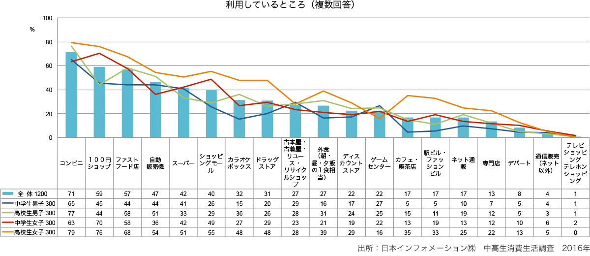 - 女子は100円ショップをよく使っており、中学生でも70%になる。また、高校生女子は、ドラッグストアやカフェ・喫茶店の利用も多い。