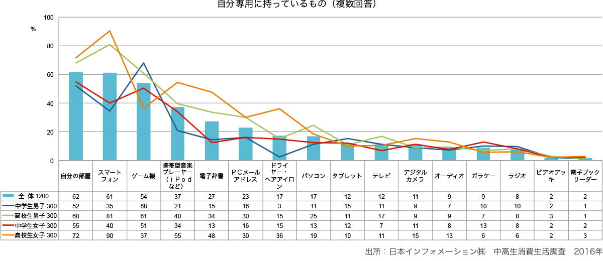 - 中高生が自分専用に持っているものでは、自分の部屋とスマホが6割。高校生では、自分の部屋よりもスマホのほうが保有率が高い。
