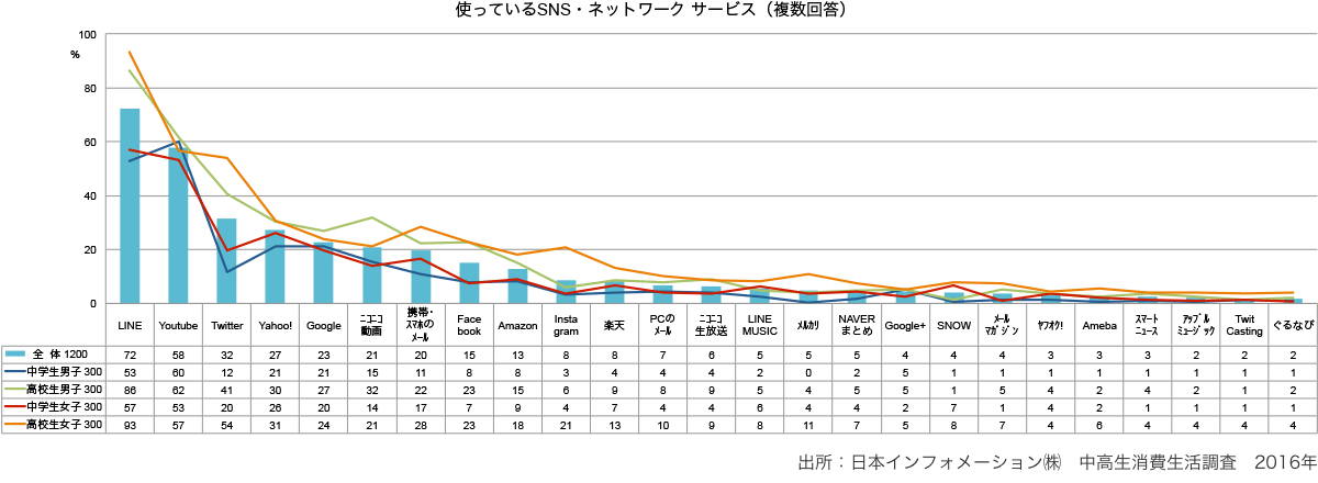 - 中央値ではLINE、平均値ではTwitterが多い。属性でみると、総じて高校生女子が多い傾向がある。