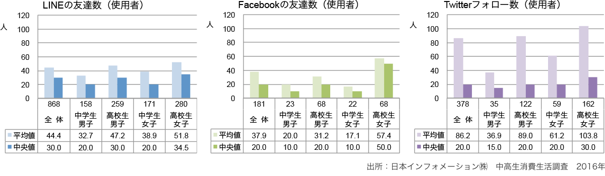 - LINE使用者の友達数は、平均値で44.4人、中央値30.0人である。