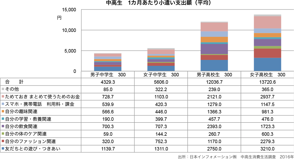 - 中高生の1カ月あたり小遣い支出平均は、男子中学生4329.3円、女子中学生5606.0円、男子高校生12036.7円、女子高校生13720.6円である。小遣いの収入源には、アルバイトを含む。
