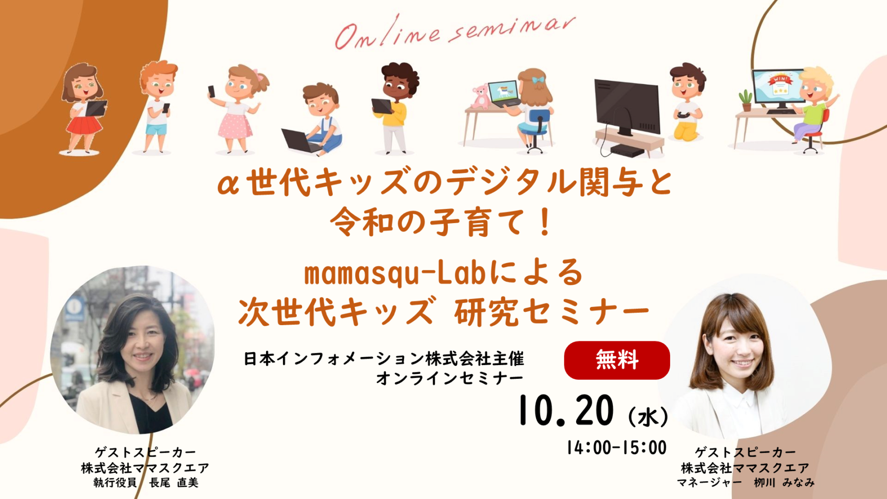今回は協業企画の第3弾として、ママスクエアで働く子育てに奮闘中のママたちと女性の多様な働き方の実現に向けて奔走されている講師より、令和時代の子どもたちが普段どのようにデジタル端末やコンテンツに触れているのか、育児をしているママはどう思っているのかにフォーカスをあて、そのインサイトからみえるマーケティング戦略の視点をご提供します。