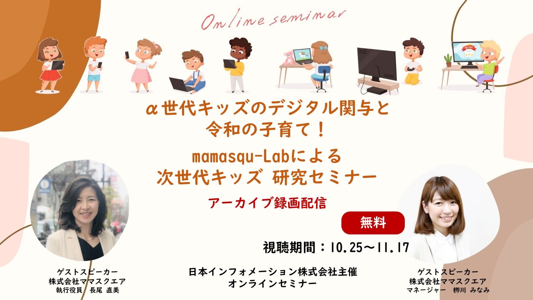日本インフォメーションで2021年10月20日に開催した「アルファキッズのデジタル関与と令和の子育て!mamasqu-Labによる次世代キッズ 研究セミナー」のアーカイブ録画視聴を開始します。