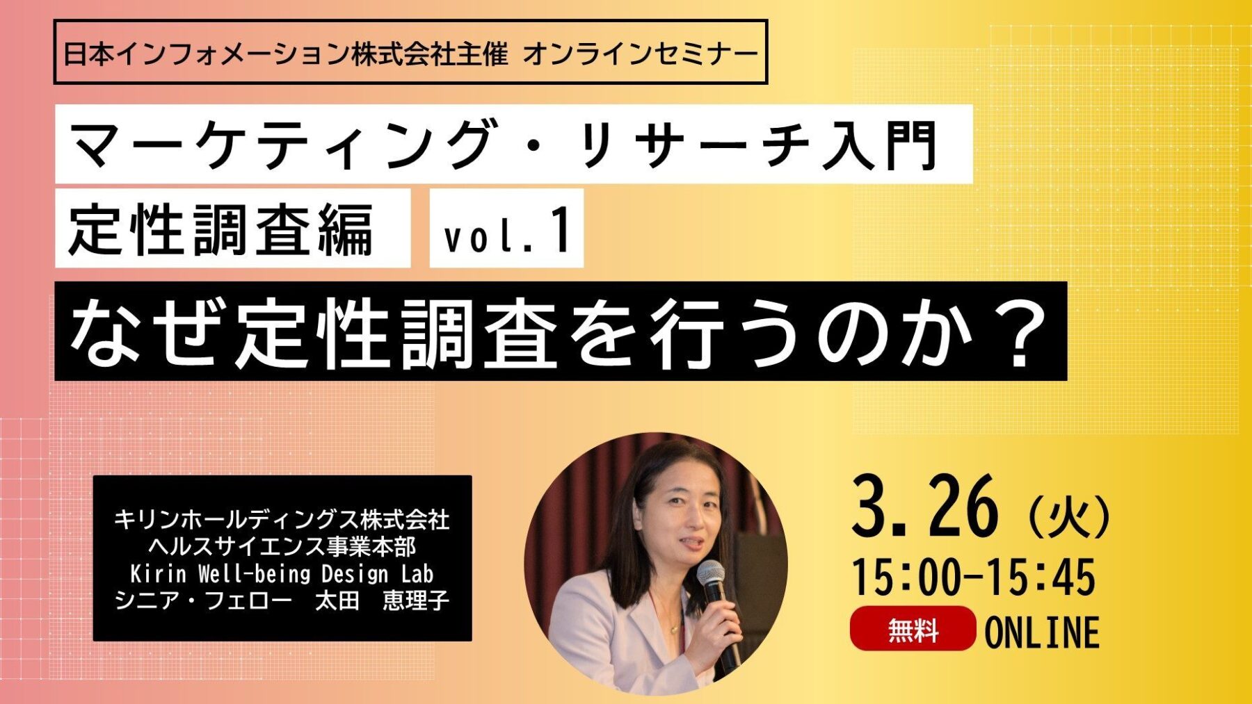 今回の定性調査編第一弾は、2007年の設立以来、「Kirin Well-being Design Lab」(※2020年4月に前身のキリン食生活文化研究所より組織名称変更)にて、食と健康の領域を軸として、生活者のライフスタイル研究や有識者へのインタビュー、変化の予兆の探索を通じて、未来洞察を手掛けられてきた太田様を講師にお迎えし、定性調査の重要性やリサーチャーに求められる役割について解説いただきます。