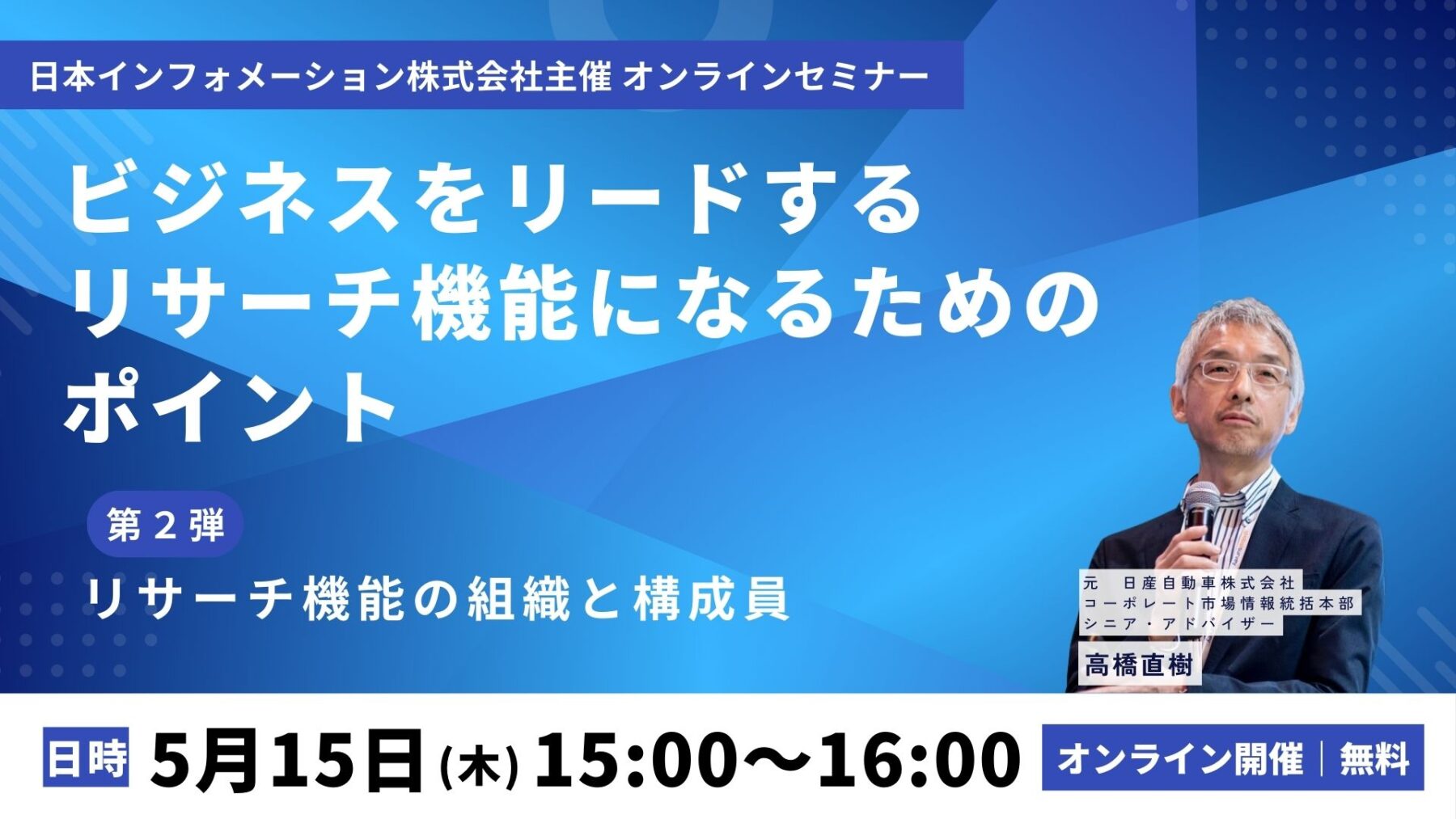そこで、本セミナーでマーケティングリサーチ部門が単なるデータ提供に留まらず、ビジネスをリードする戦略機能へと進化するためのポイントを複数回にわたってお届けします。講師には、日産自動車株式会社のコーポレート市場情報統括本部にて、商品開発やプロジェクトのマネジメント、同社初のマーケティングROI評価体系の構築・導入に携わるなど、豊富な知見と実績をお持ちの高橋氏をお迎えし、マーケティングリサーチ機能の組織論から案件進行時の実践的なノウハウまで事例を交えながら解説いただきます。
