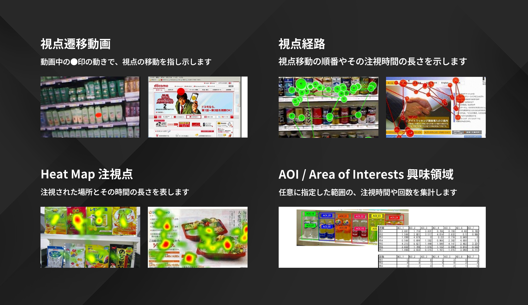 ※ヒートマップ、AOIを活用した量的データなどはオプションで提案いたします