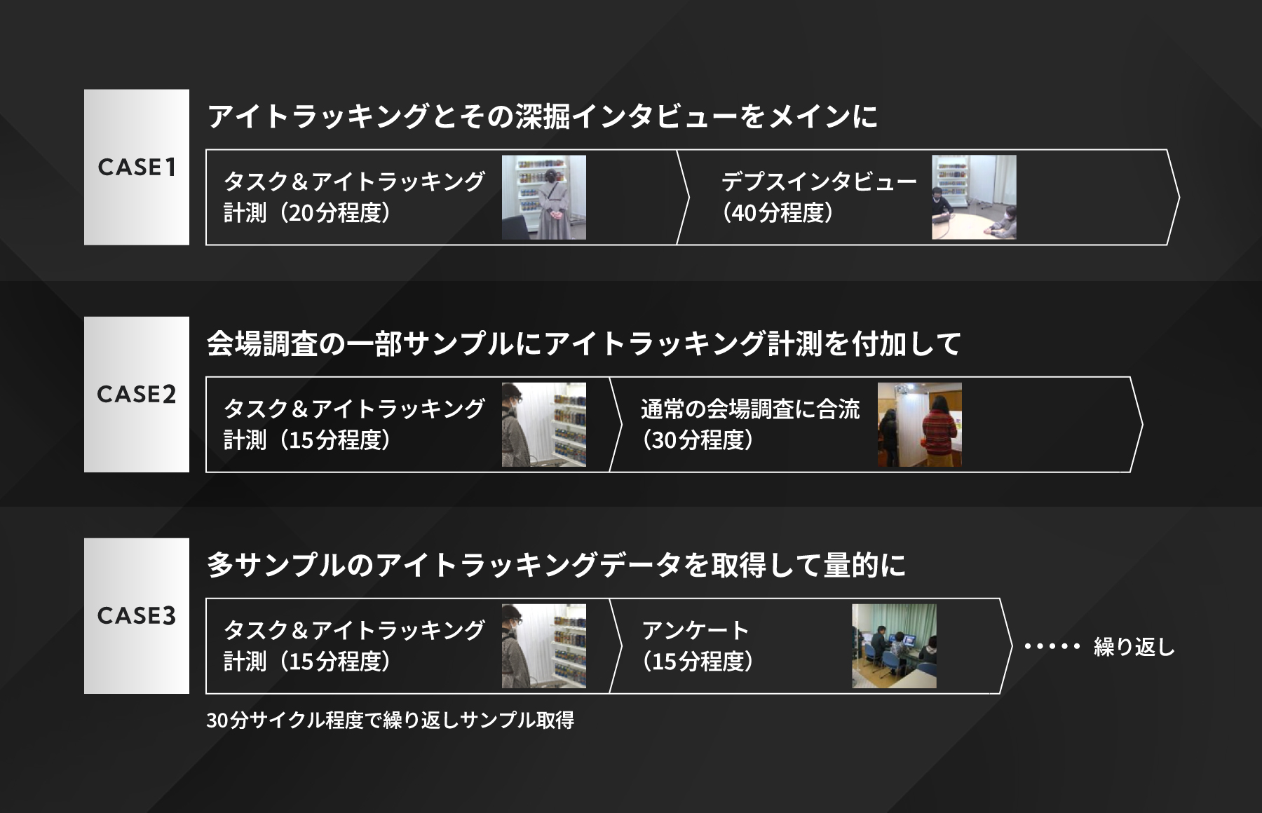 また、模擬店舗調査やホームビジットと組み合わせることで、行動と視線の両面から深い分析が可能です。