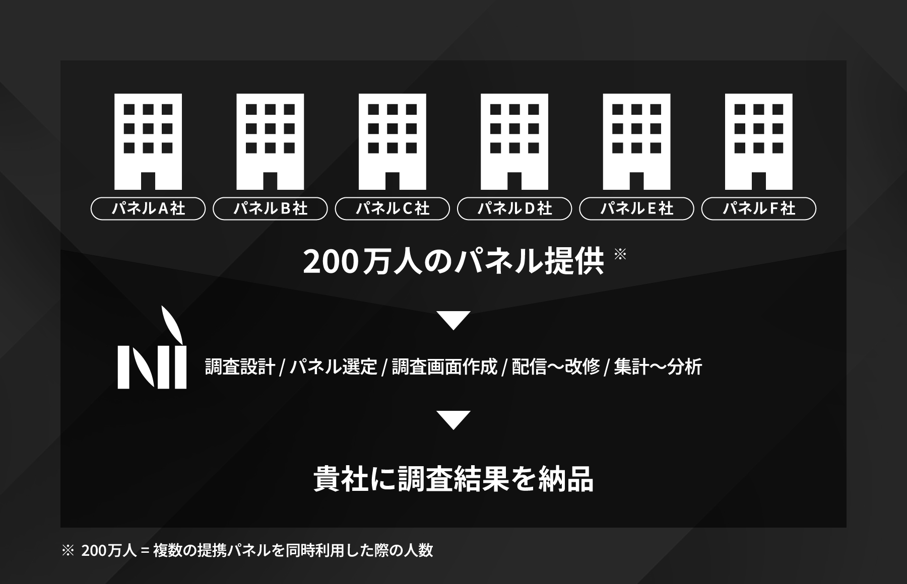 案件に応じたパネルの選択や複数パネルへの同時配信といったマルチパネル対応が可能となり、より難易度の高いリクルート条件にも対応可能です。
