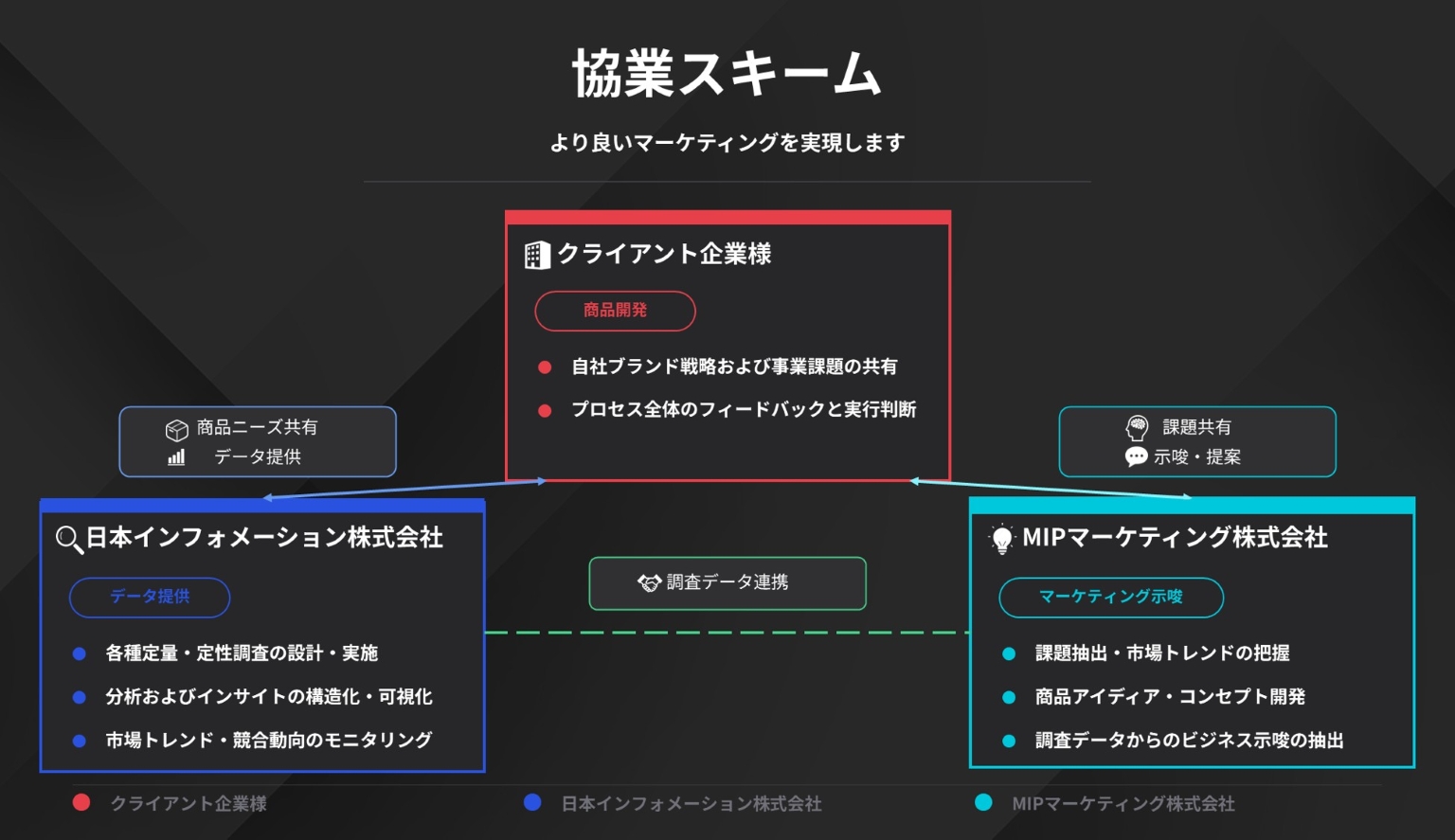 日本インフォメーションとMIPマーケティングは、役割を分担しながらも連携を密に行うことで、商品開発プロセス全体の精度向上に寄与します。